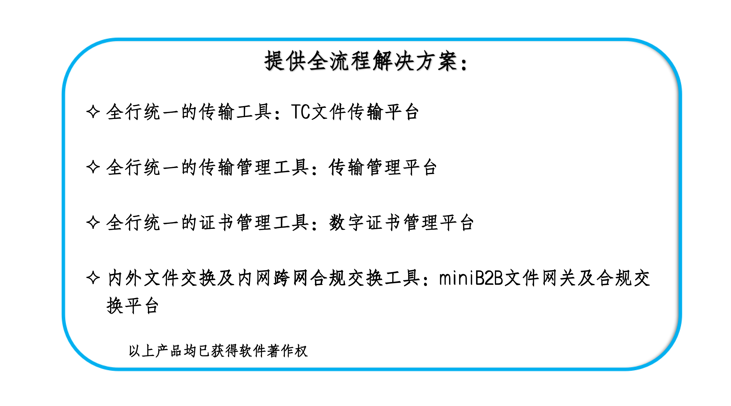 基于十多年来在各大银行、企业实施和维护传输项目,百硕公司开发了自己的“全链条国产化智慧传输解决方案”。方案汇聚了国有大行、全国性股份制银行、城商行等银行业客户的传输需求,由专注于传输产品研发和实施的团队负责,从而确保了稳定维护和定制开发的需要。 该解决方案涵盖了金融业和各企业所有的传输场景,包括内外文件交换、内网跨网文件交换、内网传输、统一传输管理和调度、自动化传输、加密证书管理等全流程。同时,支持国内外主流CPU和操作系统。目前,该方案已经在国有大行、全国性股份制银行,以及城商行等使用。
