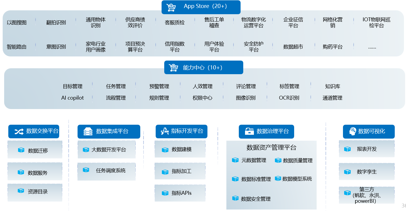 图谱包括能力中心、数据交换平台、数据集成平台、指标开发平台、数据治理平台、数据可视化等